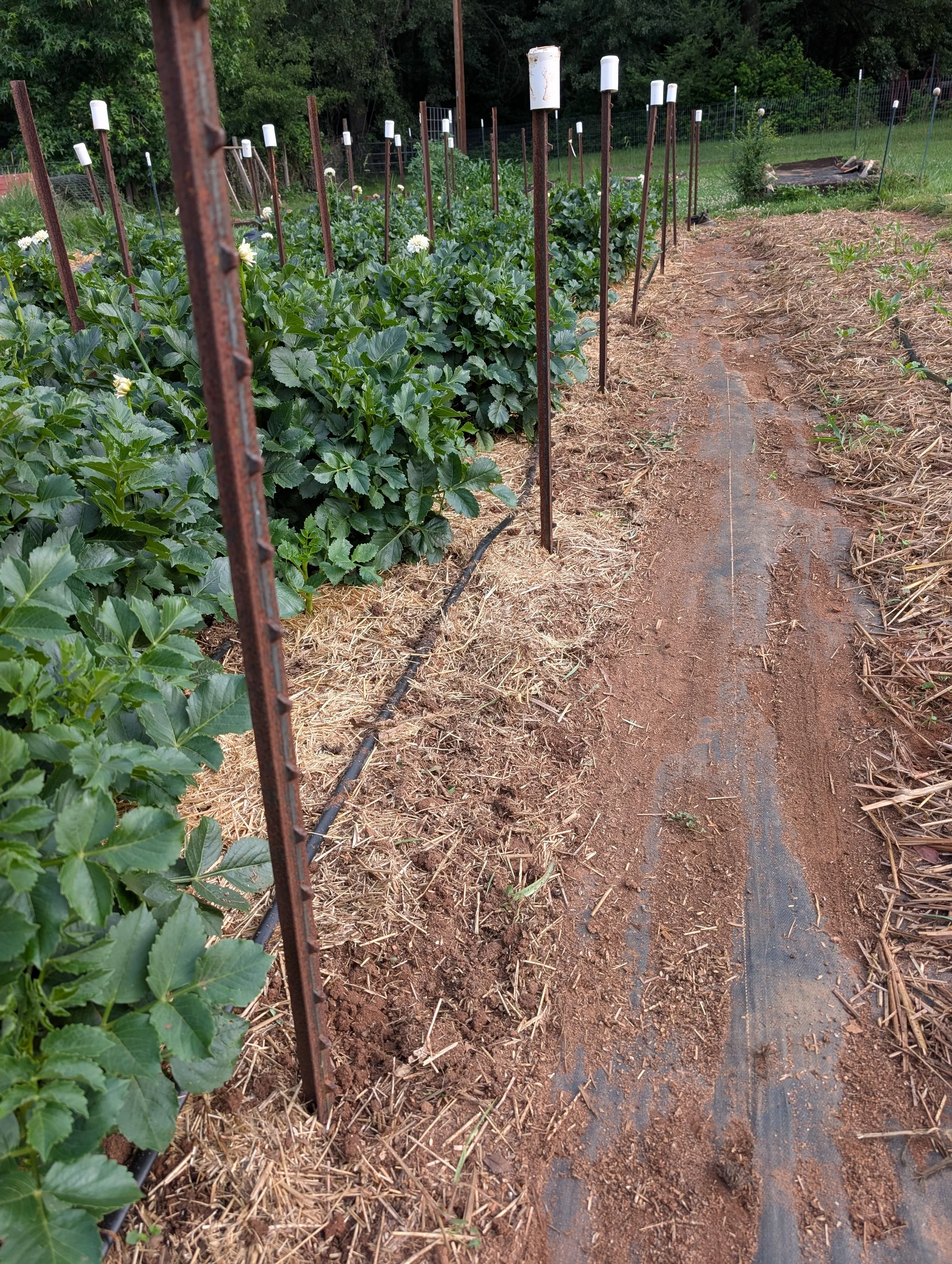 We have 2 rows of dahlias in this plot that are planted 2 across in a 4’ wide bed instead of the 4 across that we usually do so those rows tend to get very weedy on the edges.