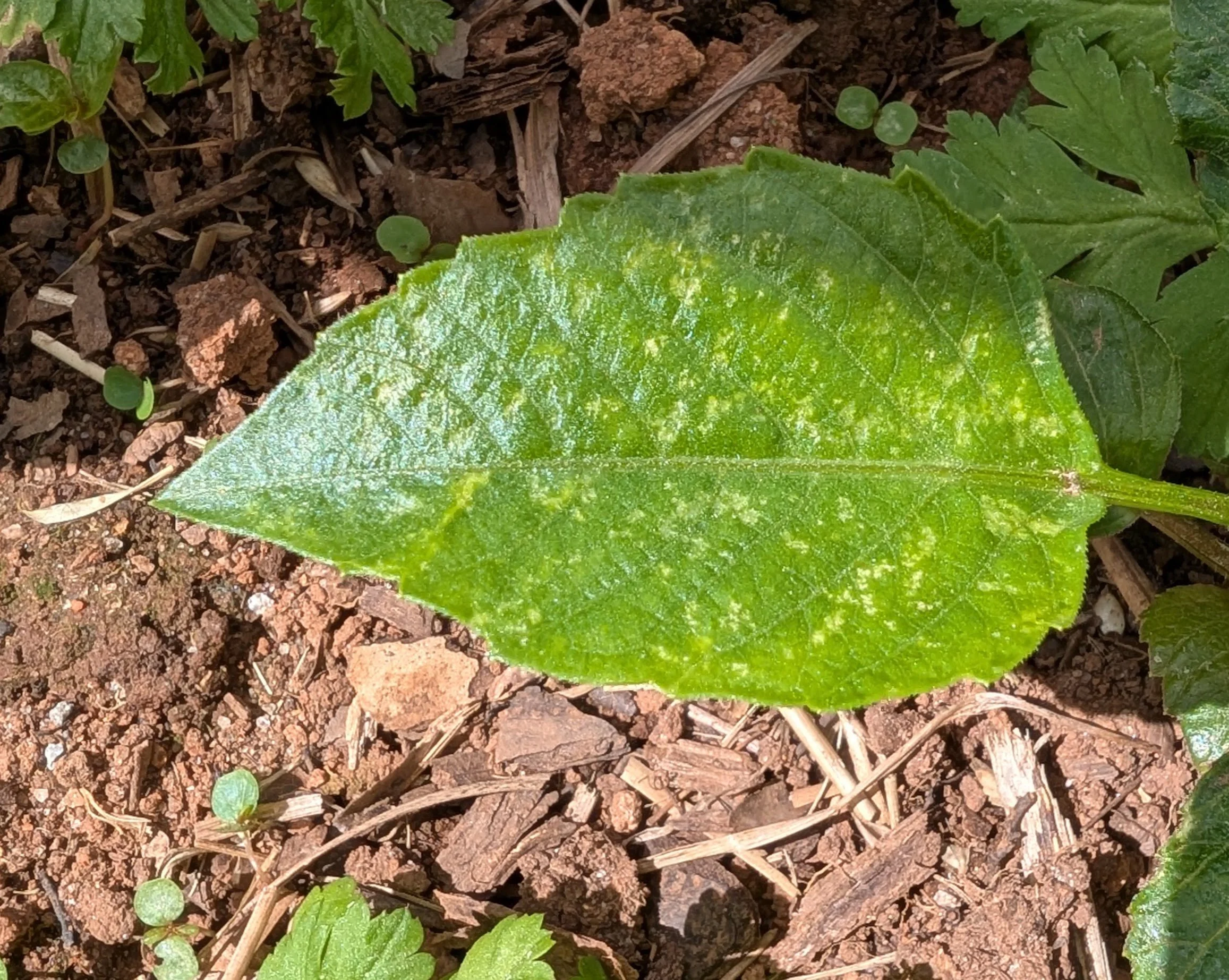 Number one- identify your pest. You have to know what you are fighting first. We’ve got thrip damage as the major pest right now. We also have a little bit of slug damage on emerging shoots and some our potted up cuttings in the hoop house.